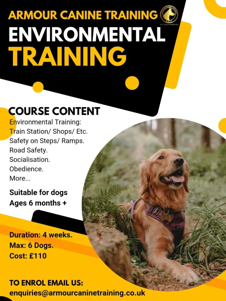 This course was initially set up as a puppy advanced training course, which was the follow on to our puppy classes. But, we believe that this class shouldn’t just be limited to just our advancing puppies, as all dogs can benefit from this course. So we changed it to an environmental training course which is accessible to all!