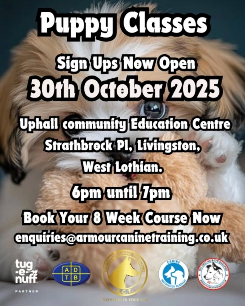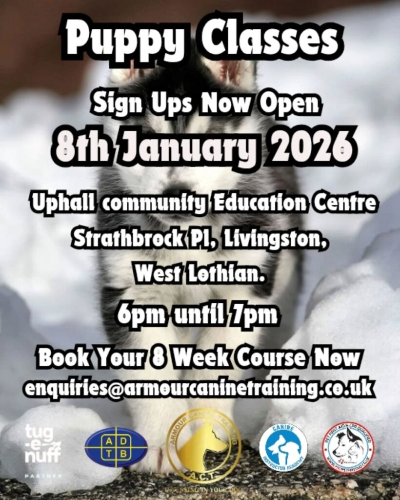 The A.C.T Dog Club takes place every Sunday in Linlithgow on private grounds, which are not accessible to the public. Each session runs between the hours of 10:15am until 11:30am, and covers a whole range of training, such as obedience, competitive obedience, socialisation, agility, scent work, tricks, impulse control and lots more.